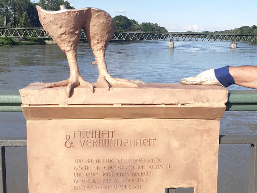 Zur Erinnerung an die bewegende Geschichte eines deutschen Soldaten und eines serbischen Gockels. Geschehen 1918 auf der Innbrücke Braunau/Simbach