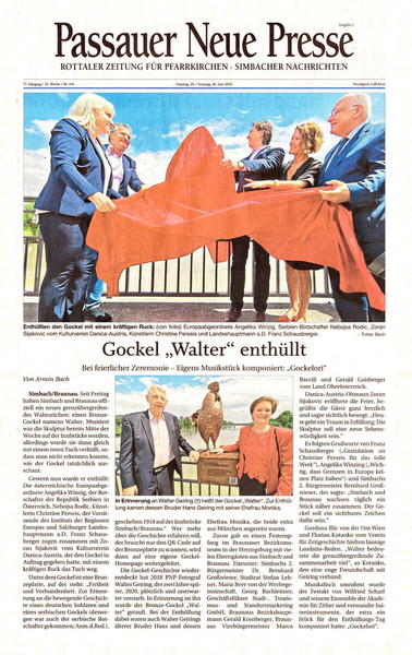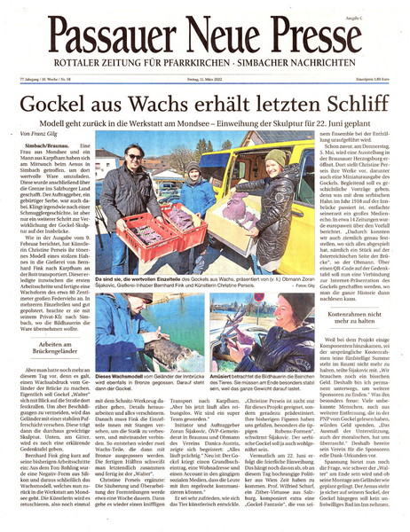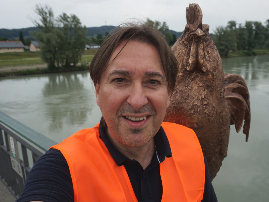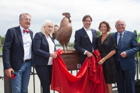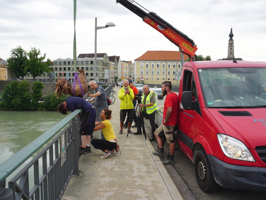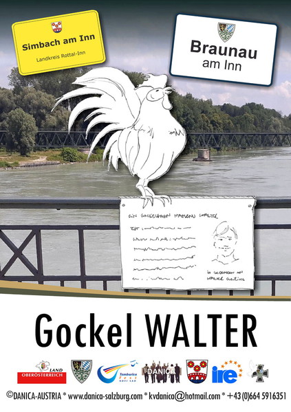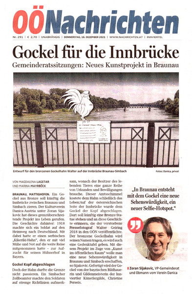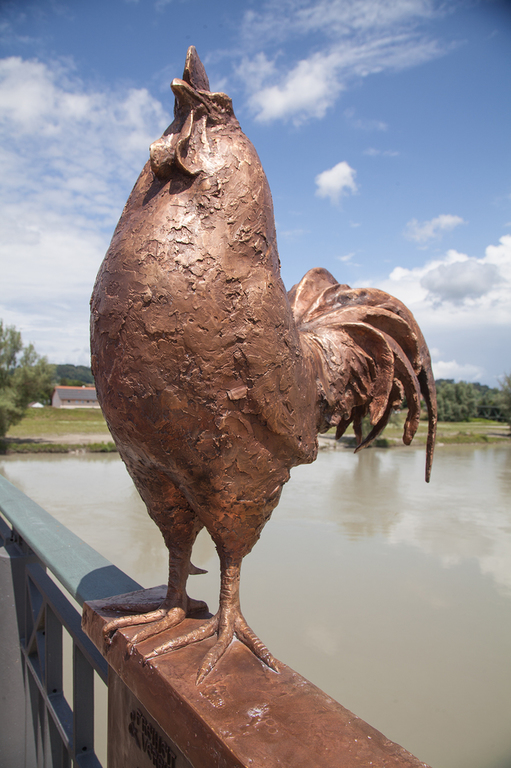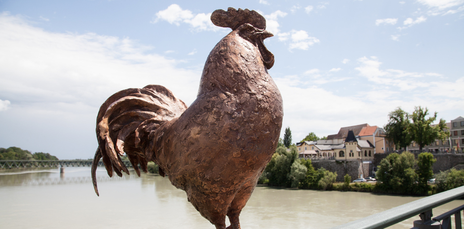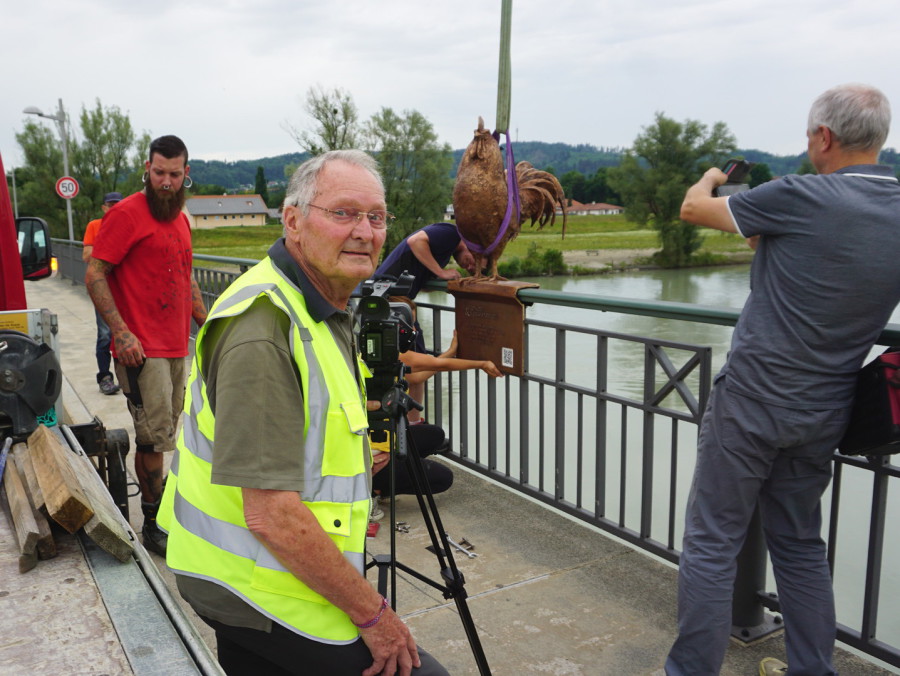Die Grenzregion Braunau/Simbach ist um eine neue Sehenswürdigkeit reicher. Eine Bronzeskulptur eines Gockels schmückt nun die Innbrücke, die die beiden Grenzstädte miteinander verbindet.