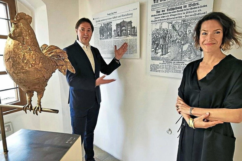 In Erinnerung an verstorbenen Pressefotografen Walter Geiring (1965 - †2020) wurde der Bronze-Gockel WALTER getauft. Bei der Enthüllung dabei waren auch Walter Geirings älterer Bruder Hans und dessen Ehefrau Monika, die beide extra aus München angereist waren.