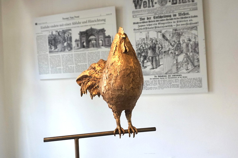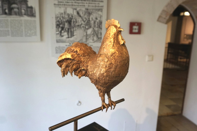 Eine Miniatur des Gockels, ausgestellt im Rahmen der Sonderausstellung der Künstlerin Cristine Perseis, in der Herzogsburg Braunau.