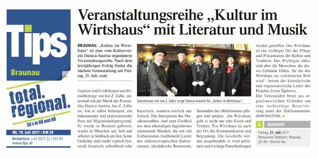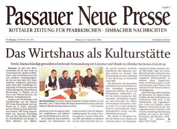 „Mit der Veranstaltungsreihe „Kultur im Wirtshaus“ fördert der Kulturverein DANICA seit mehreren Jahren den Kulturaustausch der lokalen Künstler/Innen. Gleichzeitig wird auf die regional verankerte Wirtshauskultur hingewiesen. - So der künstlerische und organisatorische Leiter des Projekts Zoran Šijaković.