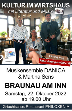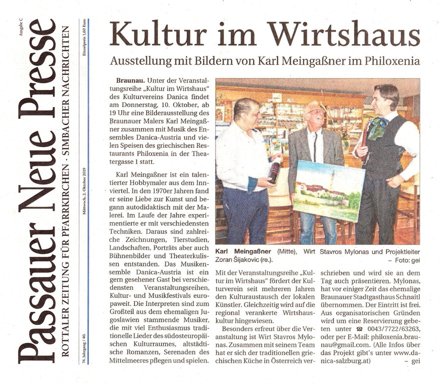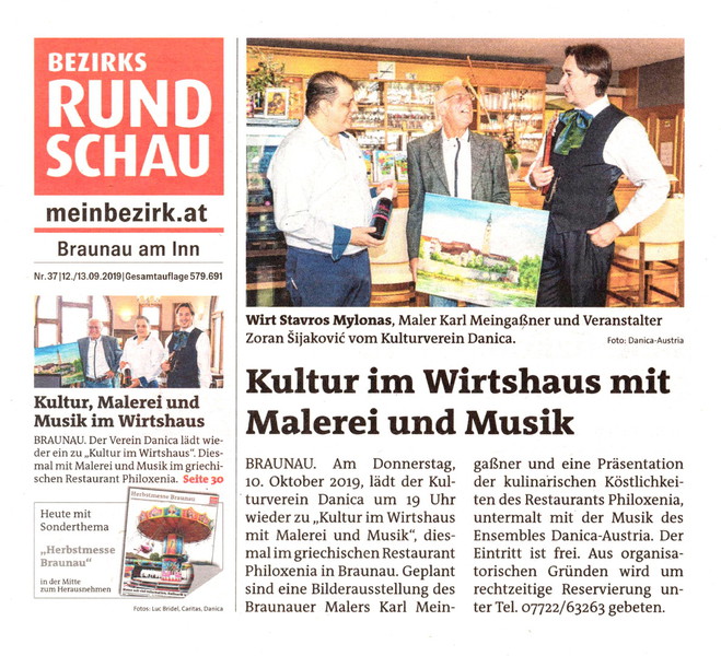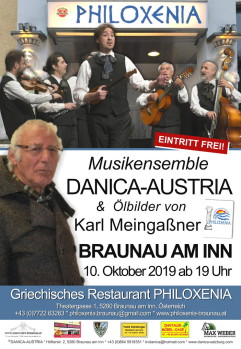 Am Donnerstag, dem 10. Oktober 2019, lädt der Kulturverein Danica um 19 Uhr wieder zu "Kultur im Wirtshaus mit Malerei und Musik". Diesmal im griechischen Restaurant Philoxenia in Braunau. Geplant sind eine Bilderausstellung des Braunauer Malers Karl Meingaßner und eine Präsentation der kulinarischen Köstlichkeiten des Restaurants Philoxenia, untermalt mit der Musik des Ensembles Danica-Austria.