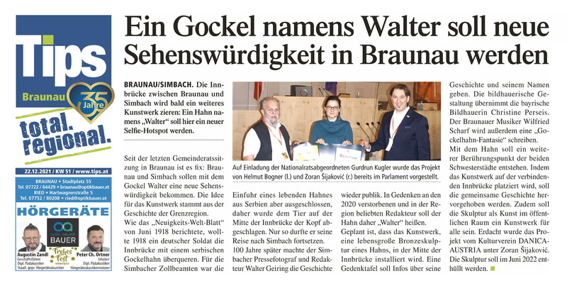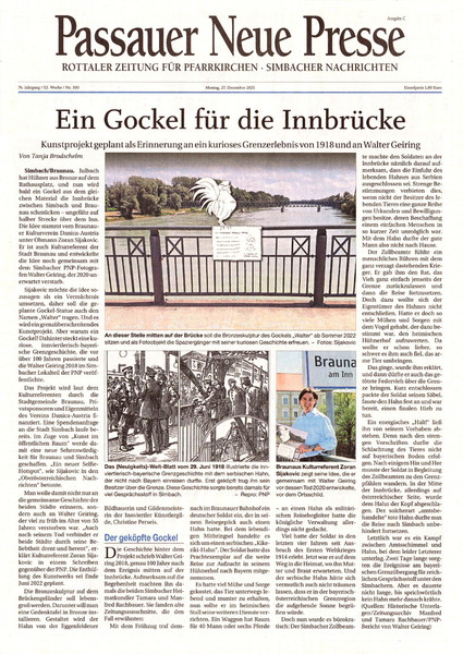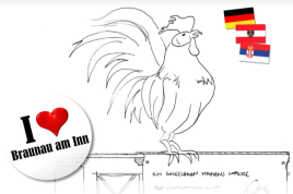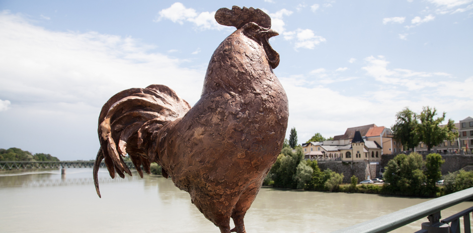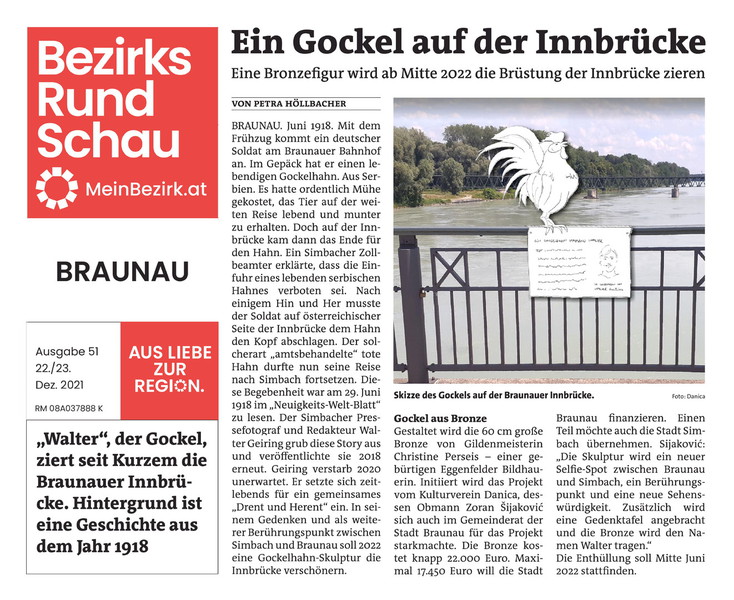 sećanje na potresni događaj, vezan za nemačkog vojnika i jednog srpskog petla, koji se 1918. godine zbio na mostu preko reke In, Braunau/Simbah.”