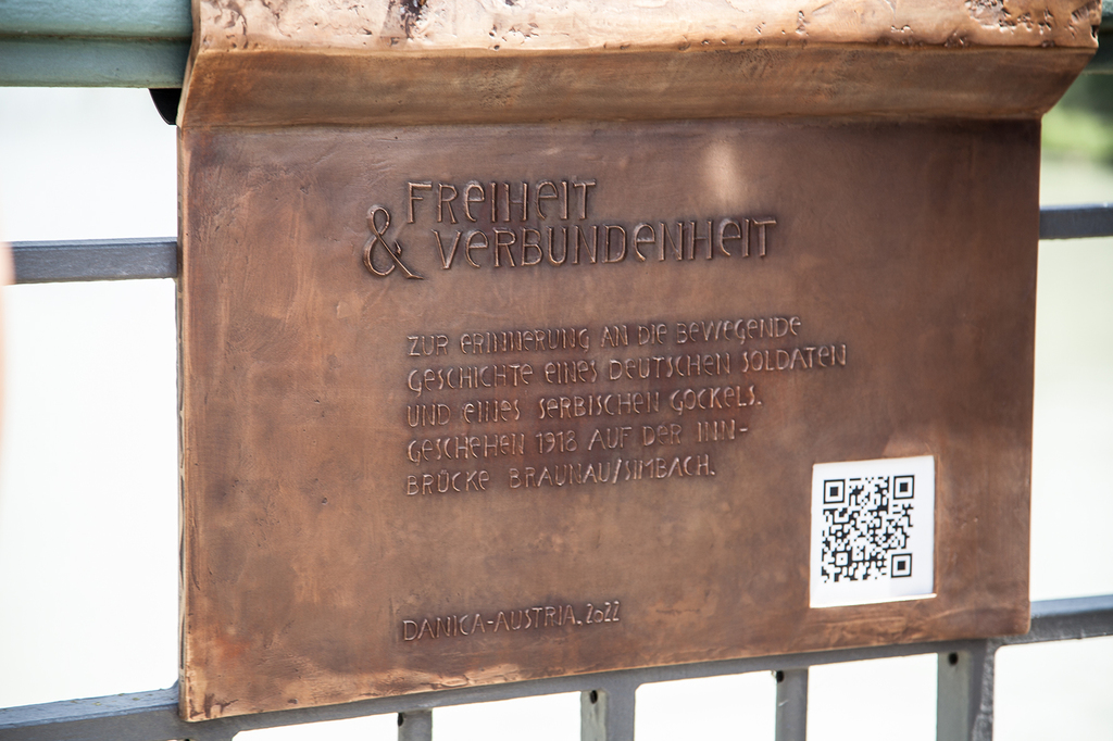„Zur Erinnerung an die bewegende Geschichte eines deutschen Soldaten und eines serbischen Gockels. Geschehen 1918 auf der Innbrücke, Braunau/Simbach.“ - „U