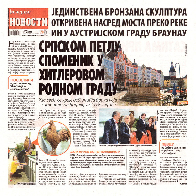 Na mostu preko reke In između austrijskog grada Braunau (Braunau am Inn) i nemačkog Simbaha (Simbach am Inn), nalazi se spomenik posvećen jednom srpskom petlu, koga je 1918. god. sa ratišta poneo nepoznati nemački vojnik i kojem je upravo na tom mestu odrubljena glava.